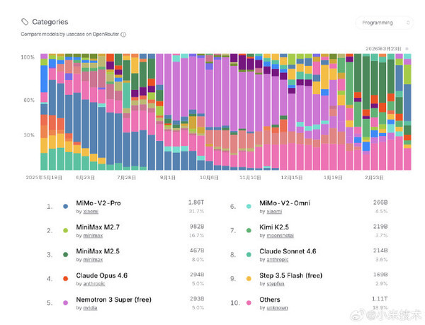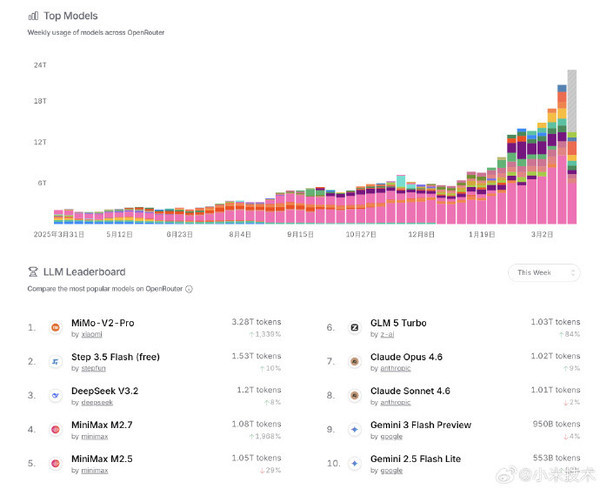【CNMO科技消息】3月27日,小米官方发文称,自研大模型Xiaomi MiMo-V2-Pro在OpenRouter平台最新周榜中位列第一,成为该平台首个周Token消耗量超过3万亿的模型,模型使用市占率超过30%。此前,该模型以匿名形式在OpenRouter上线进行早期测试,周榜数据公布后,小米正式确认其为MiMo-V2-Pro的早期版本。
