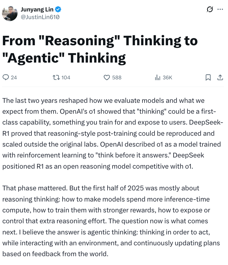 我相信答案是智能体式思考。为了行动而思考,一边跟真实环境交互,一边根据世界的反馈不断修正计划。