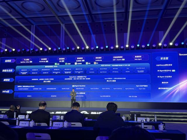 腾讯云副总裁吴运声透露,腾讯智能体全景图覆盖Infra、模型、生态、场景及应用、安全五大维度,涵盖个人提效、办公提效、研发提效等多场景,以及腾讯自研Skills、开源SkillsHub及微信、企微等在内的丰富技能生态。