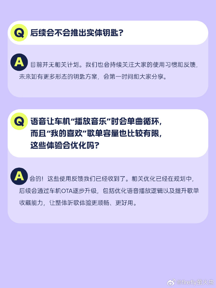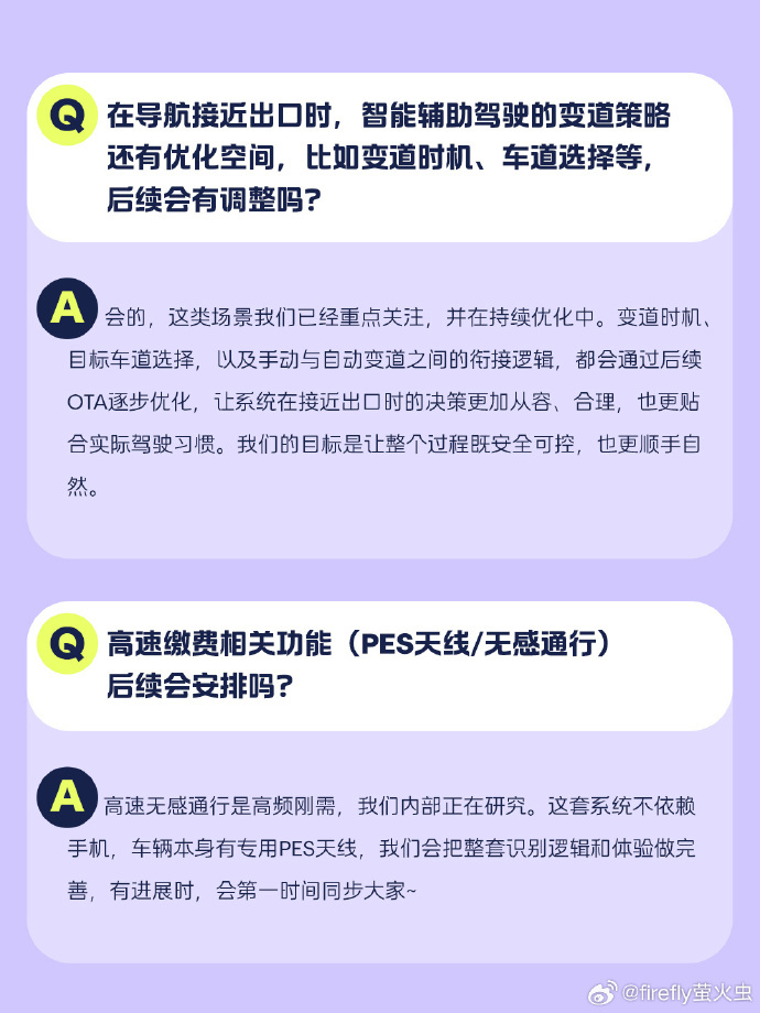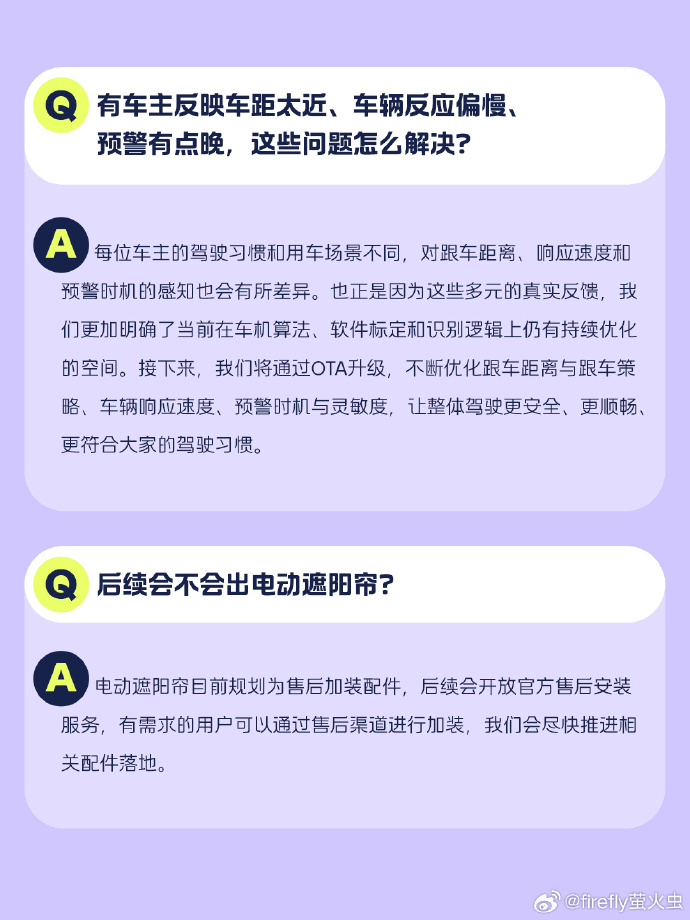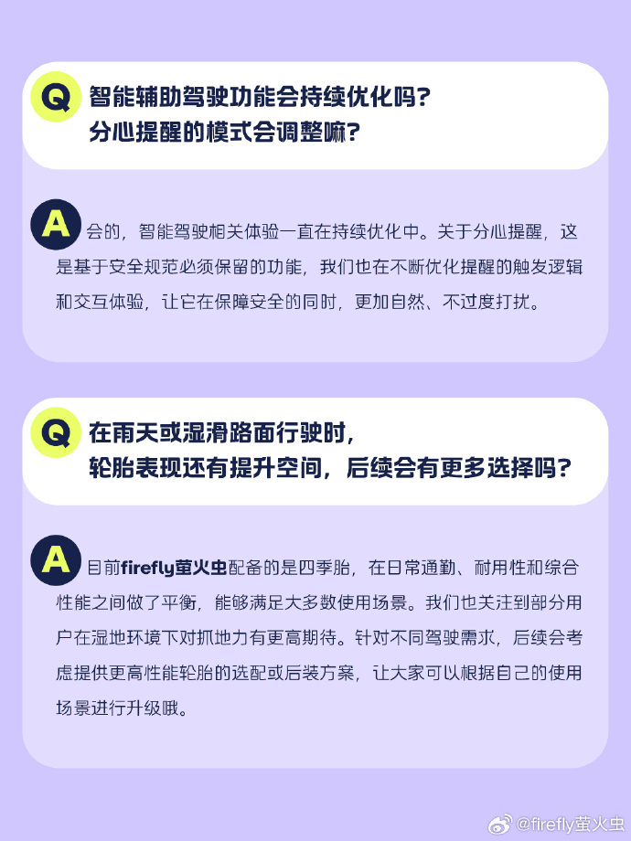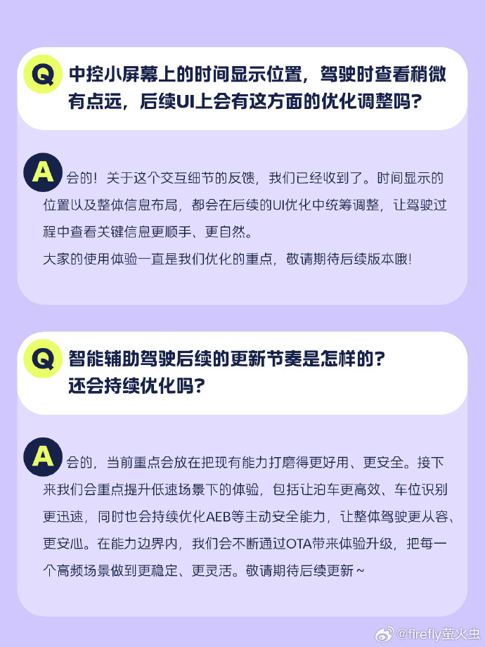 此外,官方表示会持续带来产品迭代升级,不过方式会和传统“大改款”不太一样。相比一次性的大版本更新,firefly 萤火虫更倾向于小步快跑、持续进化 —— 无论是软件还是硬件,都会在使用过程中不断优化和升级。今年也会有新的迭代版本与大家见面。同时,团队也非常重视老车主的体验,后续在硬件升级上,会尽可能考虑兼容与升级机会。