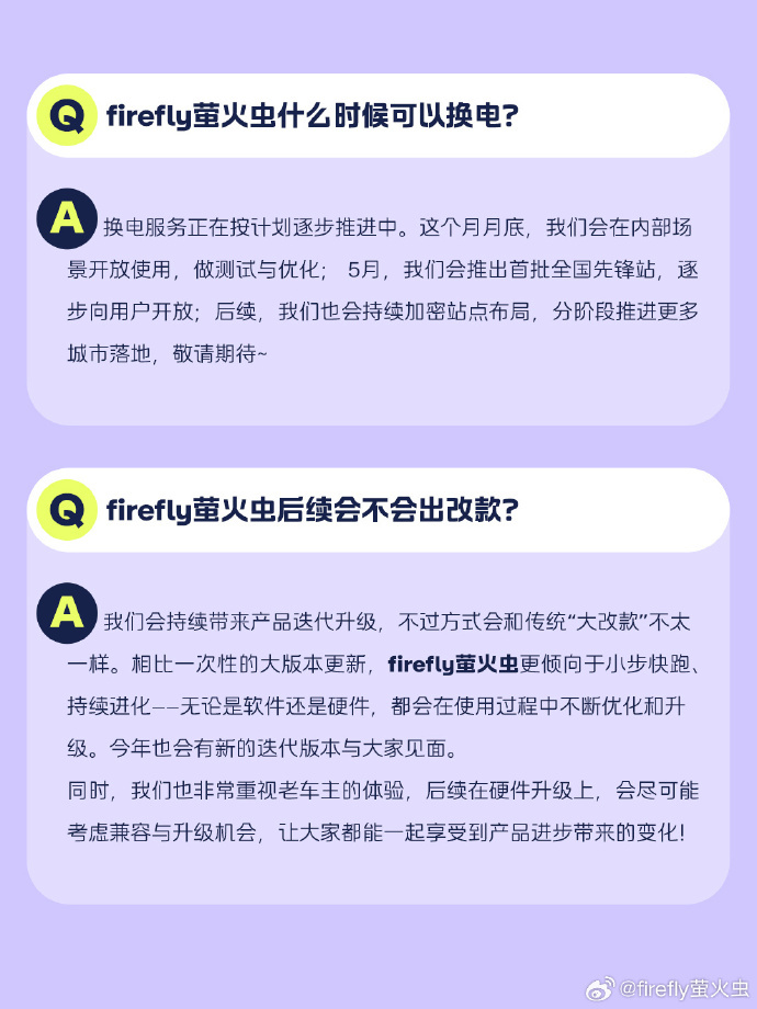 IT之家 3 月 27 日消息,蔚来 firefly 萤火虫今日发布新一期答网友问,回答了关于换电、改款等问题。