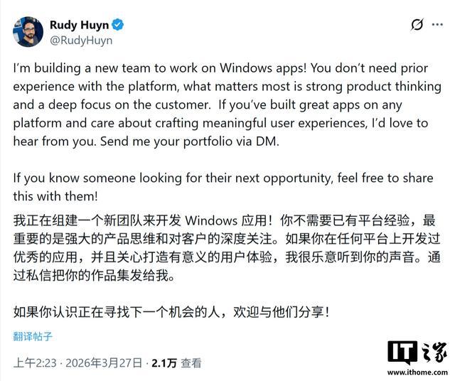 微软合伙人架构师 Rudy Huyn 证实,公司正在组建一支全新的产品团队,致力于为 Windows 11 开发“100% 原生应用”,明确拒绝将网页直接打包成软件的偷懒做法。