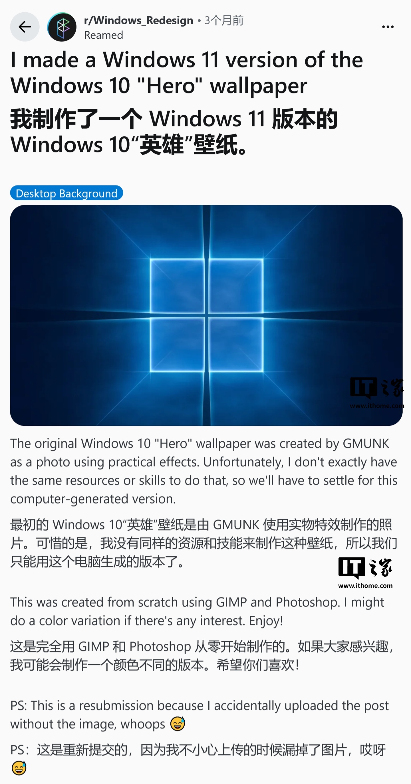 IT之家 3 月 28 日消息,科技媒体 NeoWin 昨日(3 月 27 日)发布博文,报道称网友 u/Reamed 利用 GIMP 和 Photoshop,在零 AI 参与的情况下,纯手工重制了经典的 Windows 10“Hero”壁纸,并巧妙替换为 Windows 11 LOGO。