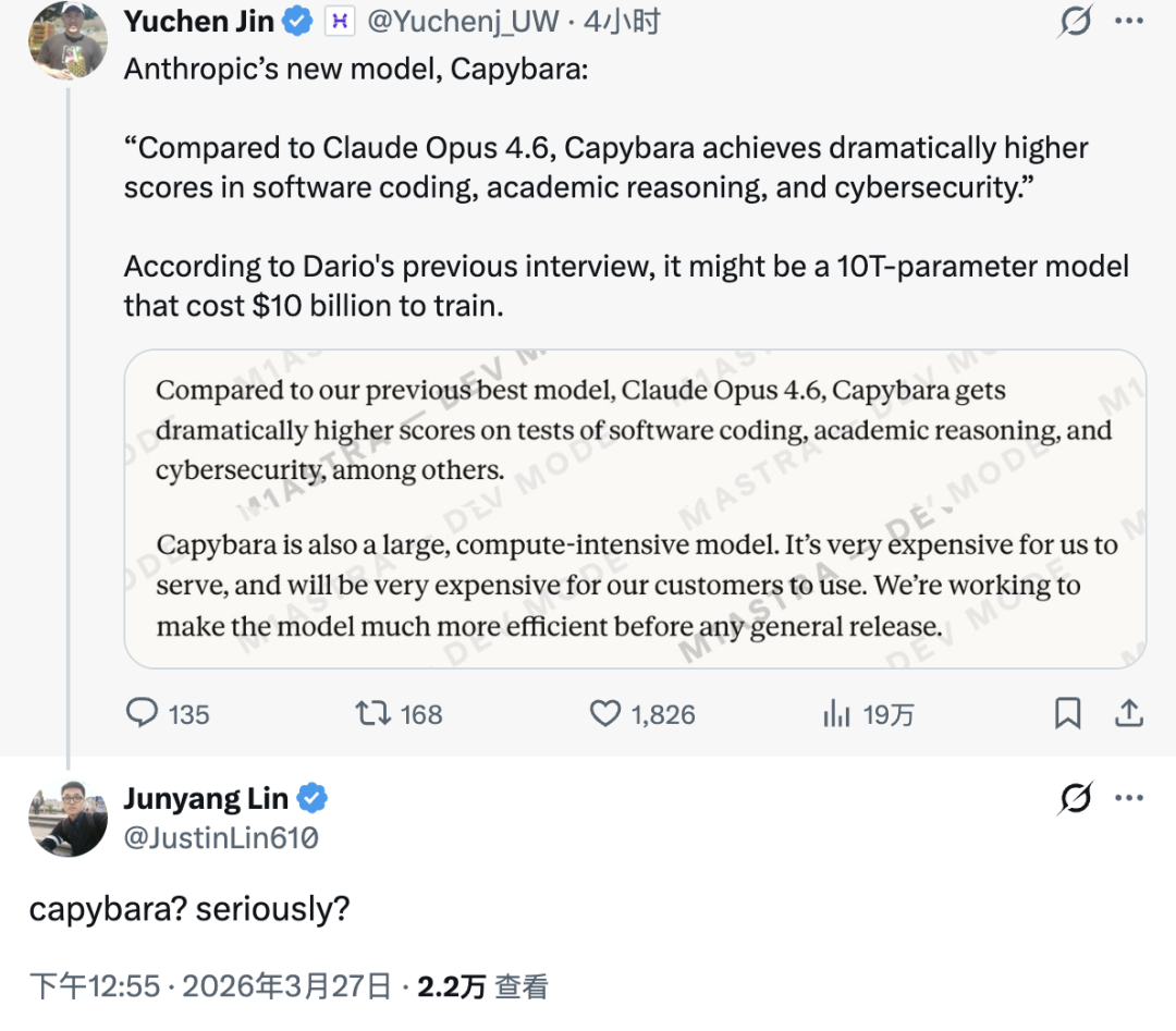 所以当 Mythos 的代号被曝光,社交媒体直接炸了。而全场最佳来自千问前技术负责人林俊旸亲自现身评论区,只留了一句: