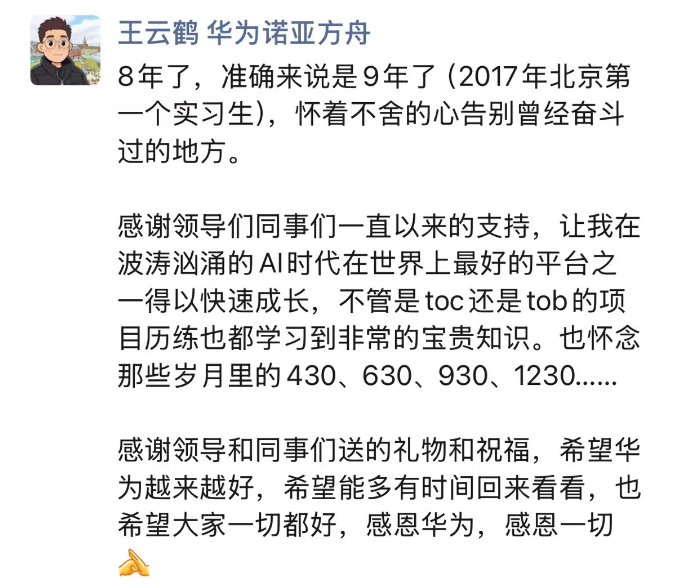 博士毕业后,他正式进入诺亚方舟实验室,直到现在宣布离职。