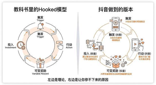 AI正在重塑我们对上瘾机制的认知。抖音通过精密设计的Hooked模型,将『可变奖励』提升至前所未有的精准度——它不仅能预测你的偏好,更能调控你的情绪节奏。本文将深度解析这套被AI优化的上瘾系统如何运作,并为你提供四步拆解工具,让你既能看透热门产品的设计逻辑,又能避免在自己的产品中陷入伦理陷阱。