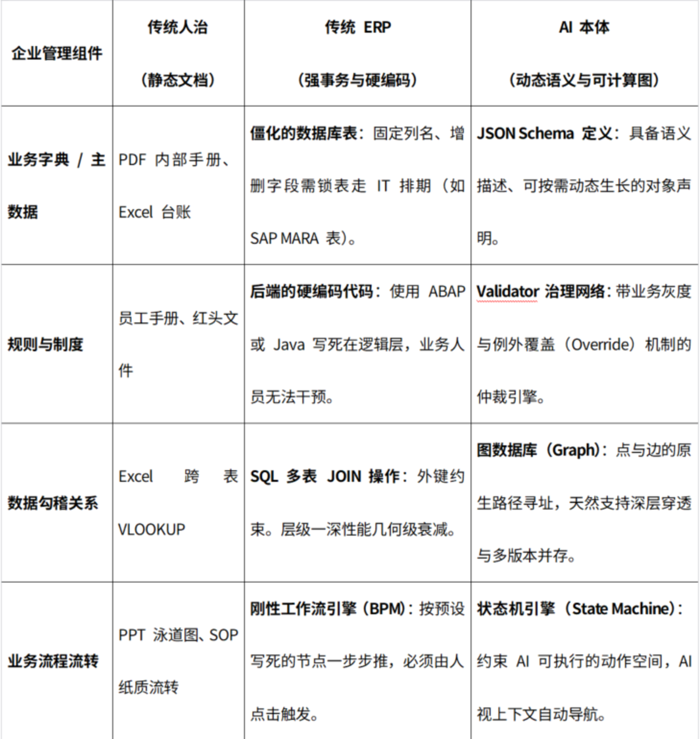在具体的工程落地中,从前农业时代的人工管理,到工业时代的传统 ERP,再到智能时代的 AI 本体,管理组件的“物理形态”发生了一次完整的代差级跃迁: