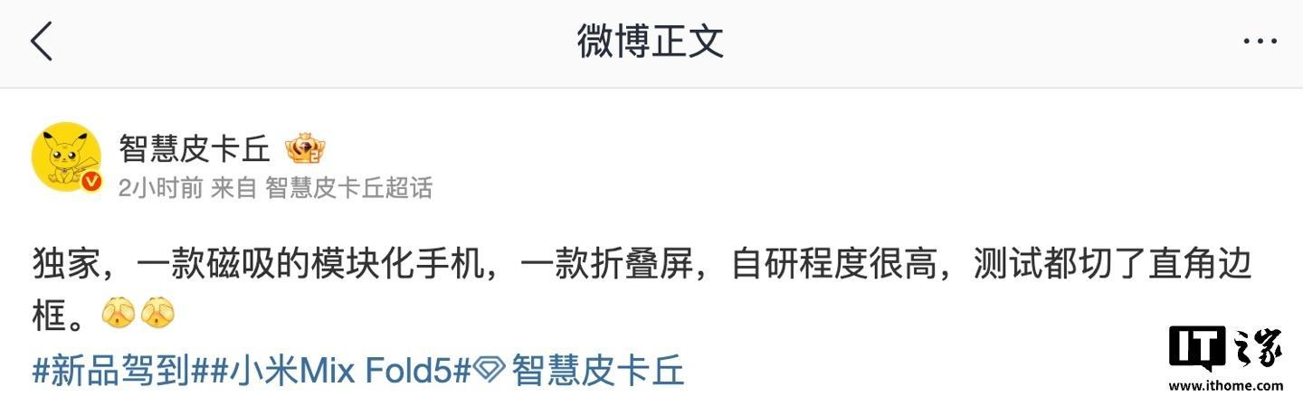 据IT之家此前援引博主消息,某厂的磁吸模块化手机、折叠屏新机自研程度很高,这两台机器测试都切换了直角边框,其中一台有可能是小米 MIX Fold 5。