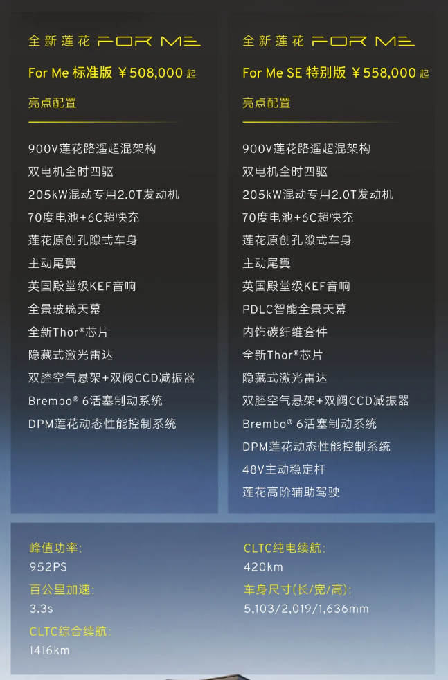 IT之家 3 月 29 日消息,全新莲花 For Me 超混 SUV 今晚正式上市,共推出标准版和特别版两款车型,售价 50.8 万元起。