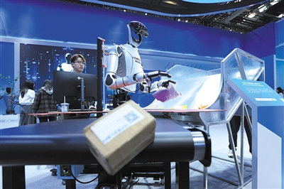 在中关村展示中心常设展上,一台半身人形机器人在进行包裹分拣展示。 新华社记者 鞠焕宗 摄