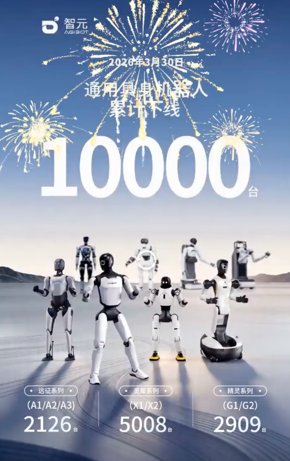 凤凰网科技讯 3月30日,智元机器人官方宣布,第10000台通用具身机器人正式下线,标志着全球人形机器人迈入规模化部署新阶段。