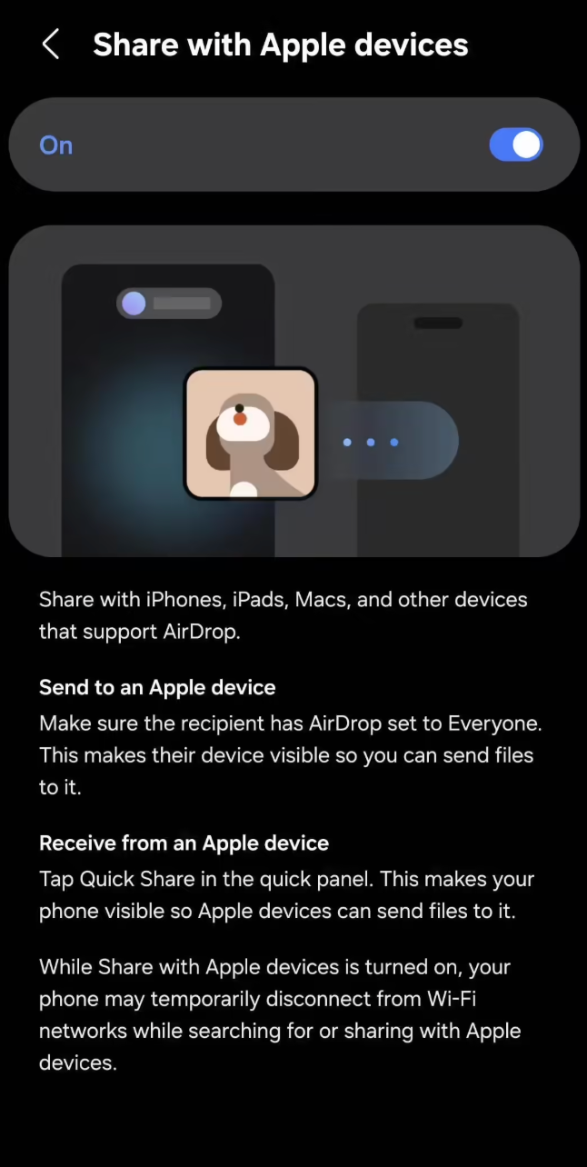需要注意的是,开启“与Apple设备共享”功能后,三星手机在与Apple设备进行搜索或传输文件的过程中,可能会出现暂时断开Wi-Fi连接的情况,这是功能运行期间的正常现象。