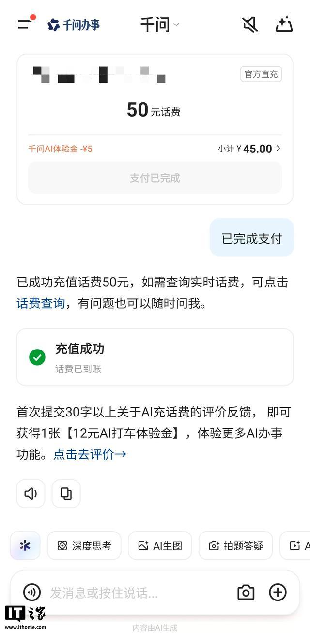 IT之家实测,打开千问 App,点击左上角“千问办事”,即可领取 12 元 AI 打车体验金以及 5 元 AI 充话费体验金。用户说出充值要求,如“帮我手机充 50”即可立减 5 元。