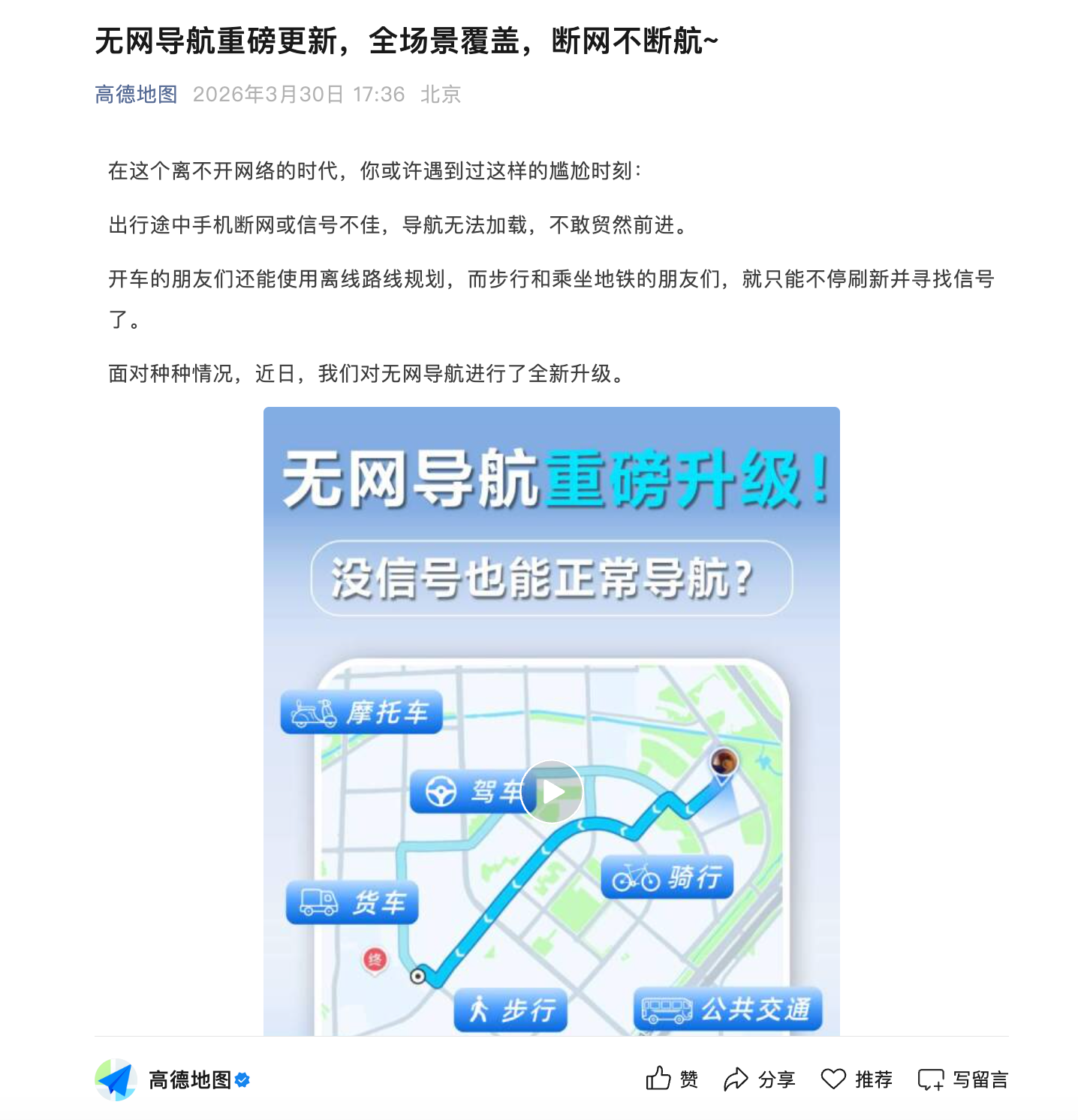 凤凰网科技讯 3月30日,高德地图近日对无网导航功能进行升级。新版无网导航覆盖驾车、公交、货车、摩托车、骑行及步行等全出行场景。