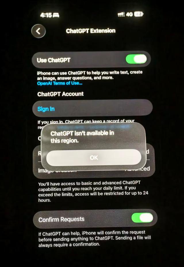 甚至还有用户打开功能后,被系统提示“ChatGPT在您所在地区并不支持”。