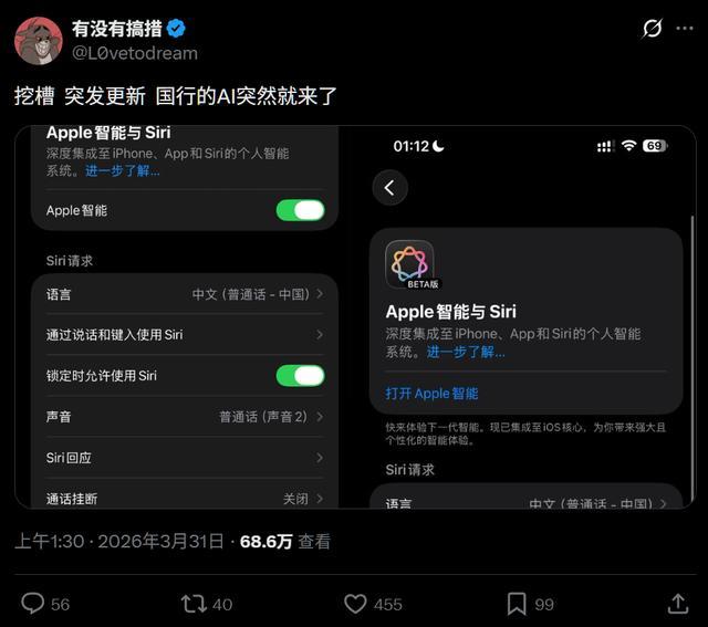 智东西3月31日消息,今天凌晨,“苹果国行AI突然来了”的消息瞬间刷屏,部分iPhone用户发现自己的系统设置里突然多了“Apple智能与Siri”的选项,并且是可以开启的。