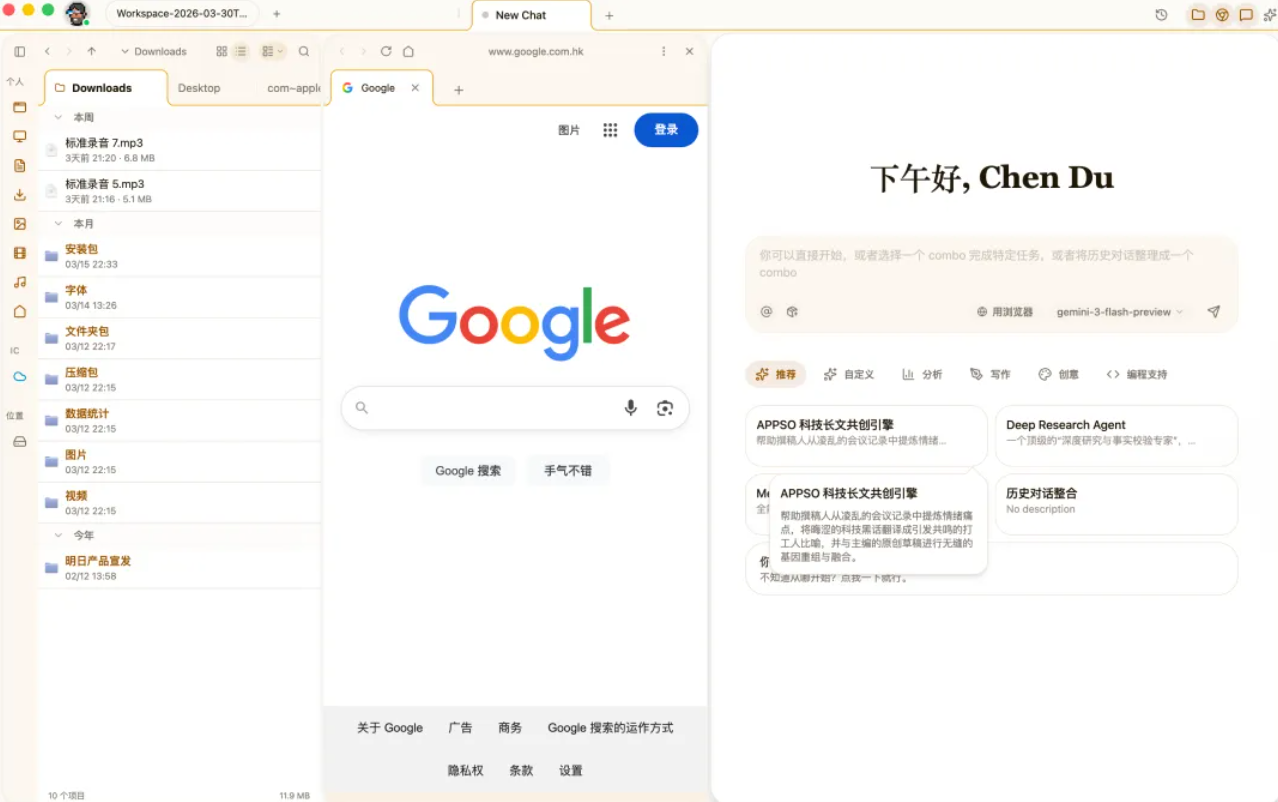 它有一个 AI 对话界面,底层可以接 Gemini 或其他模型。这么看来它有点像 Claude 的桌面端,但又比 Cowork 多一些更直观的操作逻辑。