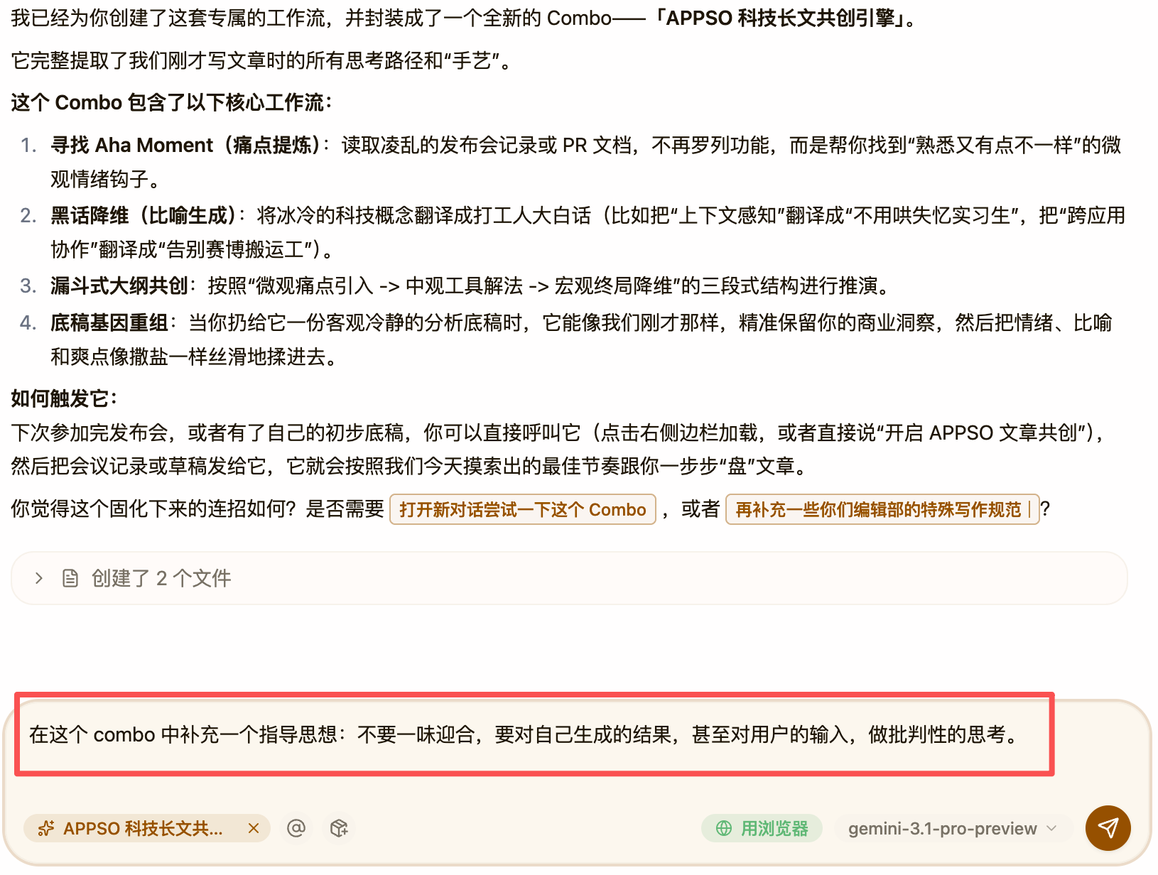 作为一位媒体编辑,我的日常工作是阅读大量资料、跟作者沟通选题、改稿子、偶尔自己写长文。这些工作的颗粒度很细,上下文很碎,跟官方预设的那些模板(更偏向标准化的报告生成、数据整理之类)对不上。