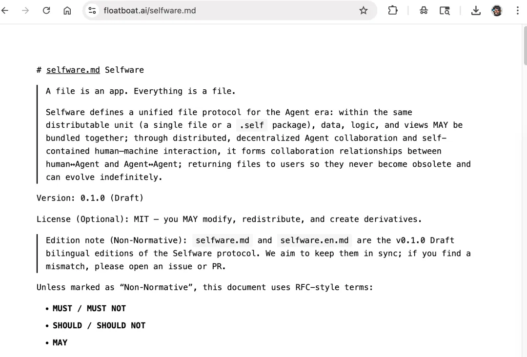 他们开源了一个协议叫 Selfware,核心理念用一句话说就是:A file is an app。