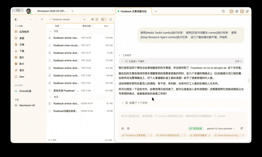 然后再说说用 Floatboat 和其他「类 Cowork」产品的区别:最大的明显感受,是 Floatboat 的工作流程很快。以文件操作、内容生成为例,在 Gemini 3.1 Pro 模型驱动下的 Floatboat,对文件进行操作(批量重命名/修改格式、填充 markdown 等)的用时,是我平时用 Cowork/Claude Code CLI 的三分之一左右。
