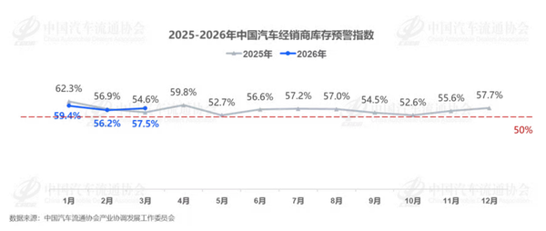 数据显示,2026年3月中国汽车经销商库存预警指数为57.5%,与去年同期相比上升了2.9个百分点,环比上升1.3个百分点,且该指数位于荣枯线之上,反映出当前汽车经销商库存压力有所增大。