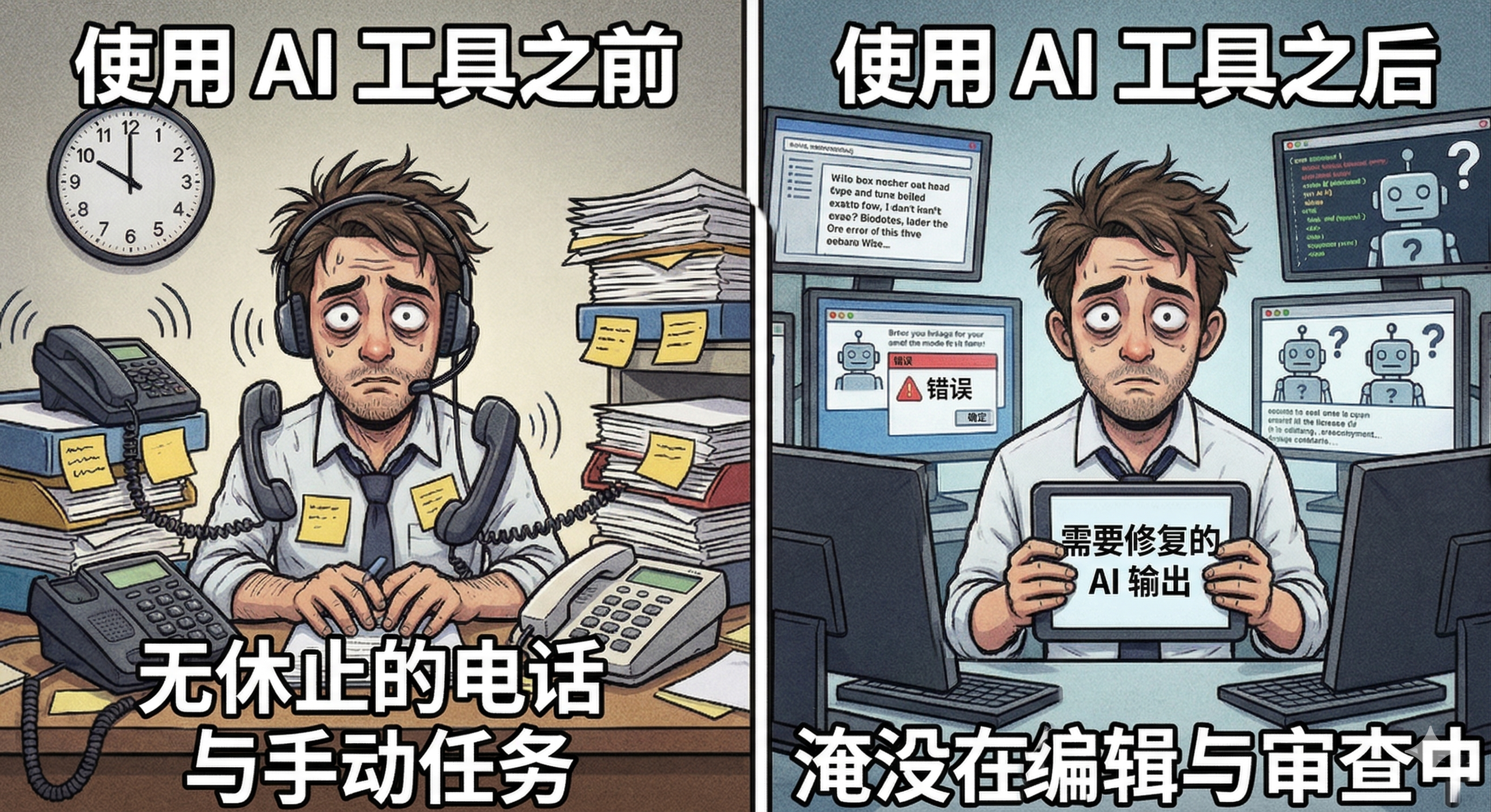 尤其是当 AI 生成的内容如海啸般涌现,可事实核查、逻辑梳理、细节修改这些需要人类判断力的工作,仍然只能由人来完成。于是,打工人的工作,从具有成就感的创造,悄然变成了枯燥又疲惫的打扫和校对。
