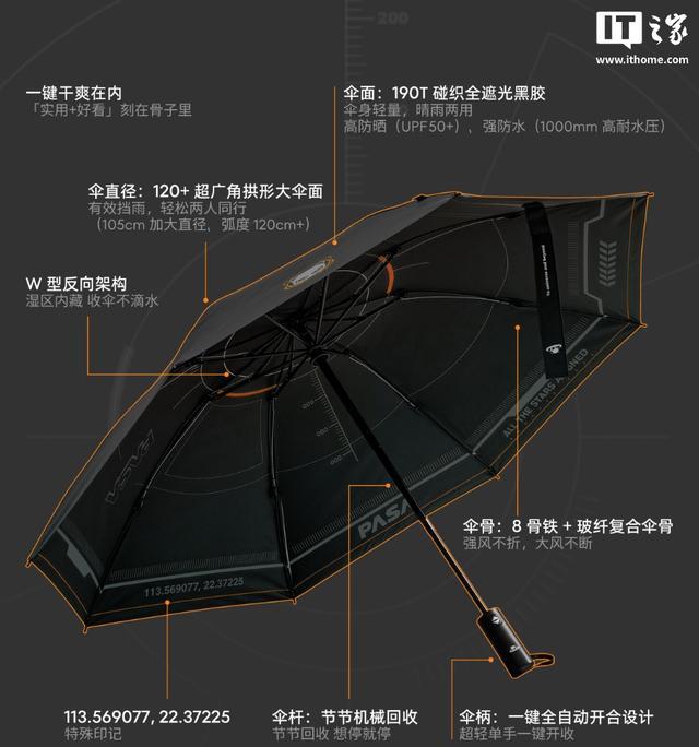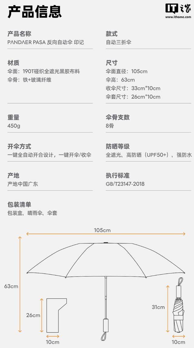 据介绍,这款伞的最大特色是反向折叠结构,收伞时湿面朝内包裹、干爽面朝外,可避免雨水滴漏弄湿衣物或车内空间。其采用玻纤材质伞骨,伞布使用 190T 碰织全遮光黑胶布面,可实现 UPF50+ 防晒效果。