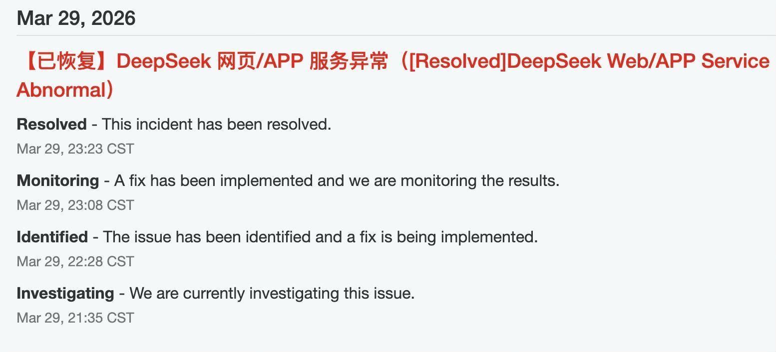 3月29日21时35分,DeepSeek监测到出现故障,其后发现是网页和App服务异常,这次故障持续到3月29日23时23分才得以被解决。