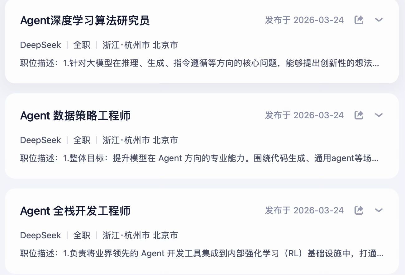 《每日经济新闻》记者注意到,在DeepSeek官网上,3月24日发布的一系列招聘岗位中,有不少和Agent(智能体)相关的岗位。譬如Agent 全栈开发工程师、Agent深度学习算法研究员、Agent 数据策略工程师等。