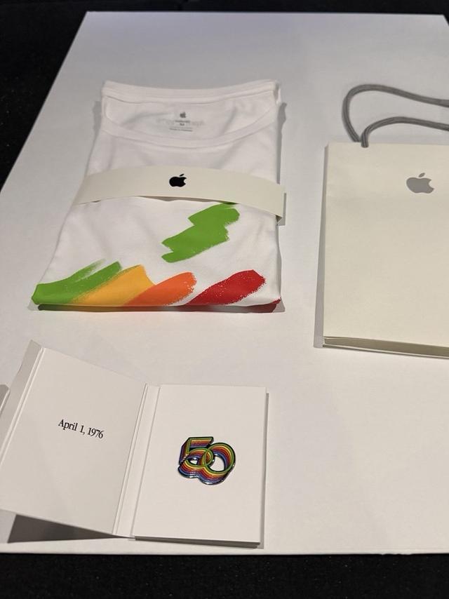 在迎来公司成立 50 周年之际,苹果向全球员工发放特别纪念礼品,并宣布将在加州 Apple Park 园区为员工举办一场周年庆压轴演唱会。苹果 50 周年纪念日为 4 月 1 日,公司为员工准备了一件纪念 T 恤、一枚珐琅别针以及一张限量版海报,三件礼品均采用苹果近期在 50 周年视觉中使用的涂鸦风彩虹苹果标志。