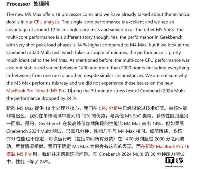 虽然该博主目前未能查明引发故障的根本原因,但好消息是,苹果官方后续寄出的全新 M5 Max MacBook Pro 在测试中表现一切正常,当前的性能衰减只能归咎于特定批次的硬件制造瑕疵。