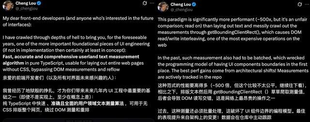 Cheng Lou在社交平台X上对Pretext给出了极高评价:“未来几年UI工程领域最重要的基础组件之一。”