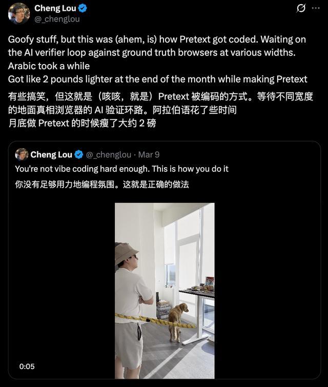 有趣的是,Cheng Lou还自曝,Vibe Coding不够,边等结果边转呼啦圈就是正确的做法,他透露做Pretext这个月下来,他人都瘦了快2磅。