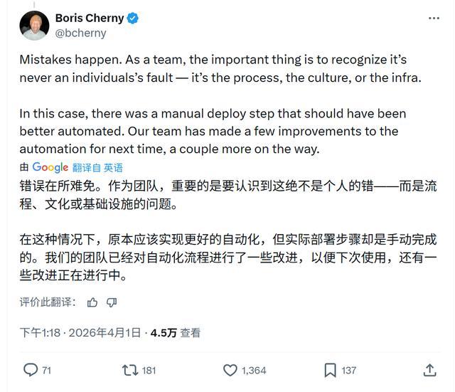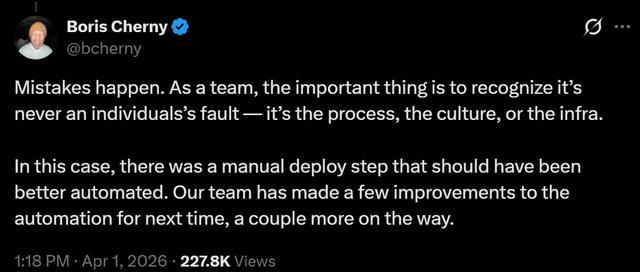 智东西4月1日报道,今天下午,Claude Code负责人鲍里斯·切尔尼(Boris Cherny)在X上回应了Claude Code开源事件。他坦言,此次事故是团队问题,一个本应自动化的部署步骤却以手动方式完成,团队已着手改进自动化流程,更多改进措施仍在进行中。