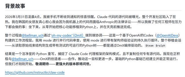 据他本人在claw-code的readme中写到,他凌晨被消息惊醒,女朋友担心持有Claude源码会惹上官司,于是他用Python重写了一套功能类似的系统,命名为“claw-code”推上GitHub。