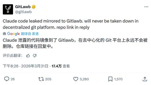 Gitlawb在X上宣布镜像Claude Code泄露源码