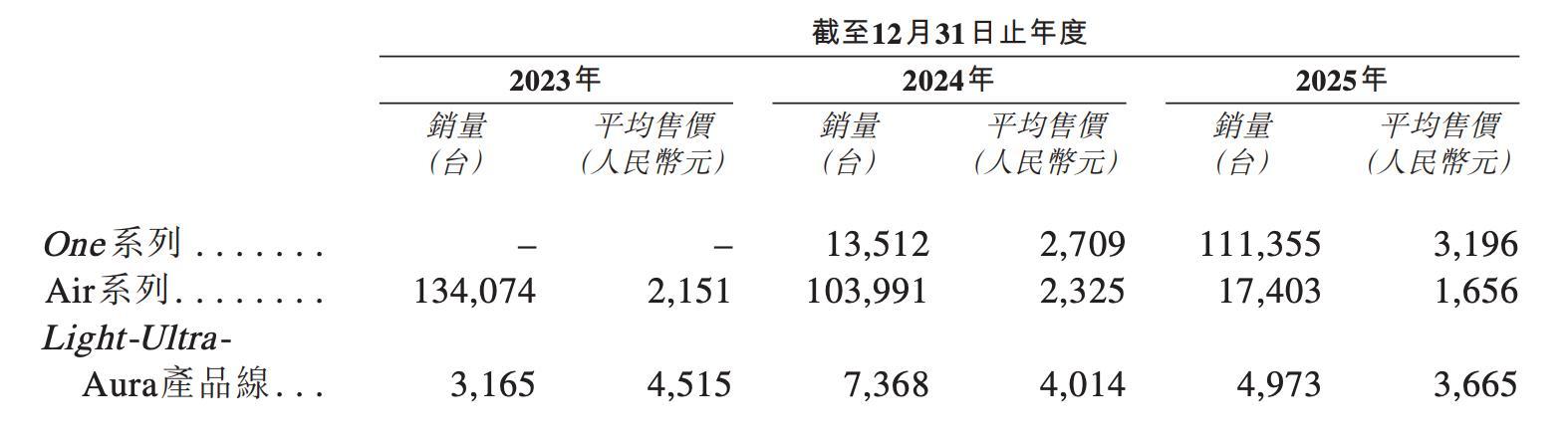 从销量和均价角度看,2025年One系列的平均售价为3196元、Air系列的平均单价为1656元、Light-Ultra-Aura产品线平均单价为3665元,销量分别为11.13万台、1.74万台、0.5万台。