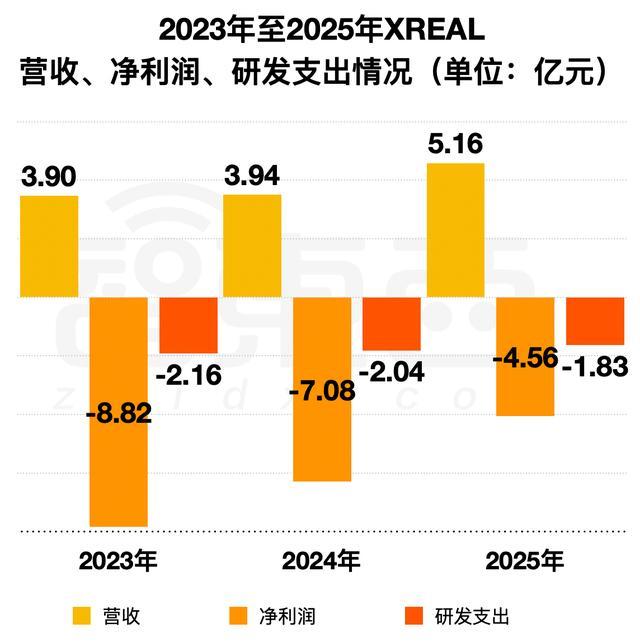 2023年至2025年,XREAL的营收分别为3.9亿元、3.94亿元、5.16亿元,净利润为-8.82亿元、-7.08亿元、-4.56亿元;研发投入分别为2.16亿元、2.04亿元、1.83亿元,占总收入的比重逐年减小,分别为55.3%、51.8%、35.5%,招股书提到是由于研发效率提升、收入规模持续扩大。