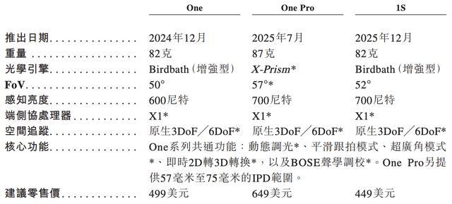 One系列进一步强化了显示和交互能力。其设备搭载了Micro-OLED显示技术、定制化X1端侧协处理器及可根据不同光线条件自动调节亮度的电致变色镜片。