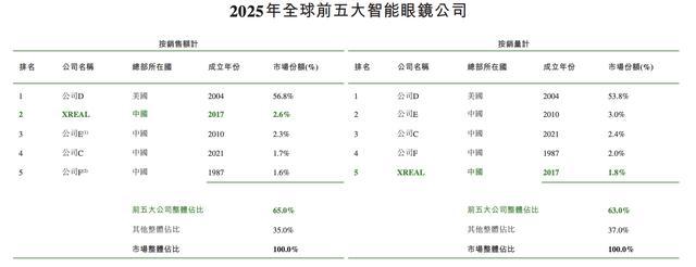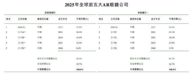按2025年销售收入计,XREAL在包含AR眼镜和无显示眼镜的整个智能眼镜市场排名全球第二、中国第一。按批注估计公司E为小米、F为华为。