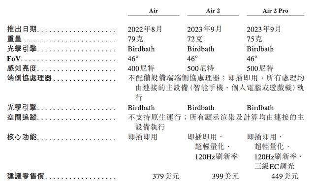 其中,Air系列是入门级产品,用户基础更大。该产品聚焦沉浸式观影、主机游戏及移动办公等高频场景,佩戴体验与普通眼镜相近,支持即插即用,能连接手机、PC和游戏主机。