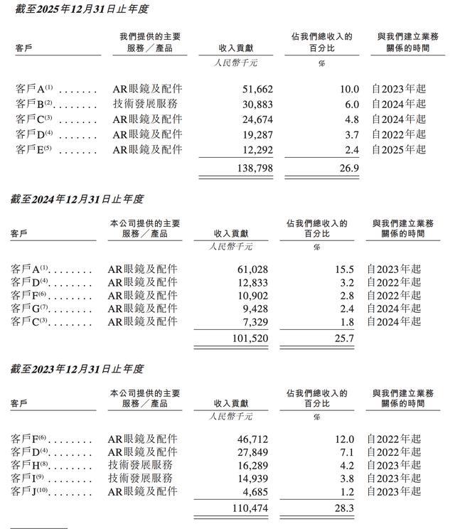 XREAL的客户包括个人消费者、第三方分销商、企业客户。2023年至2025年,其每年对前五大客户的销售额分别为1.1亿元、1.01亿元、1.39亿元,分别占同年总收入的28.3%、25.7%及26.9%。