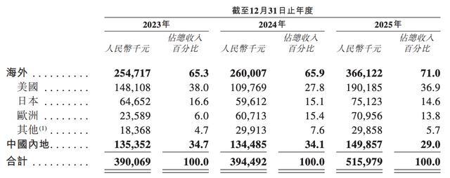 从地区分布来看,XREAL在海外的营收占比较大,2023年至2025年均超过65%,且逐年递增。根据招股书,XREAL的销售网络已覆盖40个国家和地区。