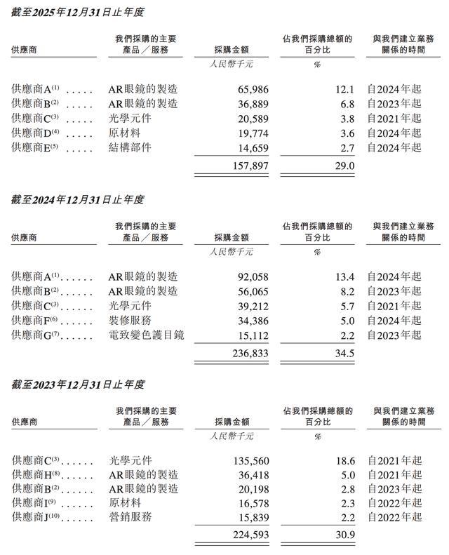 其供应商主要包括生产所用原材料的供应商、第三方制造服务供应商、硬件设计服务供应商。2023年至2025年,XREAL向前五大供应商的采购额每年飞别为2.25亿元、2.37亿元、1.58亿元,各占同期采购总额的30.9%、34.5%及29.0%。