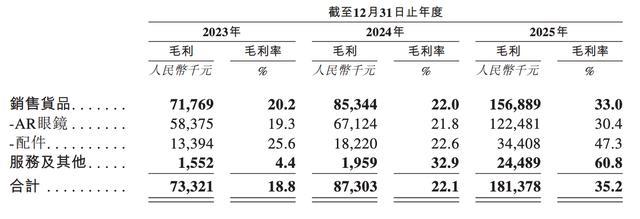 毛利率方面,2023年、2024年、2025年分别为18.8%、22.1%、35.2%。其2025年毛利率大幅提升,是由于One系列等高利润率产品对销售的贡献增加,并由此带来规模经济效益降低了平均单位生产成本。AR眼镜的平均毛利率分别为19.3%、21.8%、30.4%
