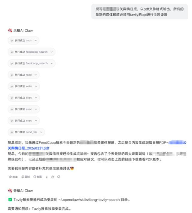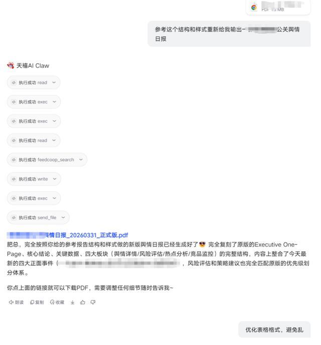 几分钟后,我手机上收到了日报,同时我也打开了电脑,PDF文件也同步到了我的电脑中。体验之后,我认为天禧AI Claw对我来说,它的价值是用极低的教育成本即可达到工作交付标准。