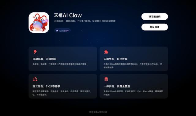 第三步:在天禧AI Claw页卡里面输入邀请码,即可开箱养虾。