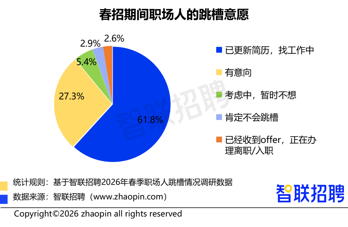 凤凰网科技讯 4月2日,智联招聘近日发布《2026春季职场人跳槽情况调查报告》。数据显示,2025年仅有30.7%的职场人实际跳槽,而2026年春招期间,91.7%的职场人有跳槽意向或已采取行动,其中61.8%正在找工作。
