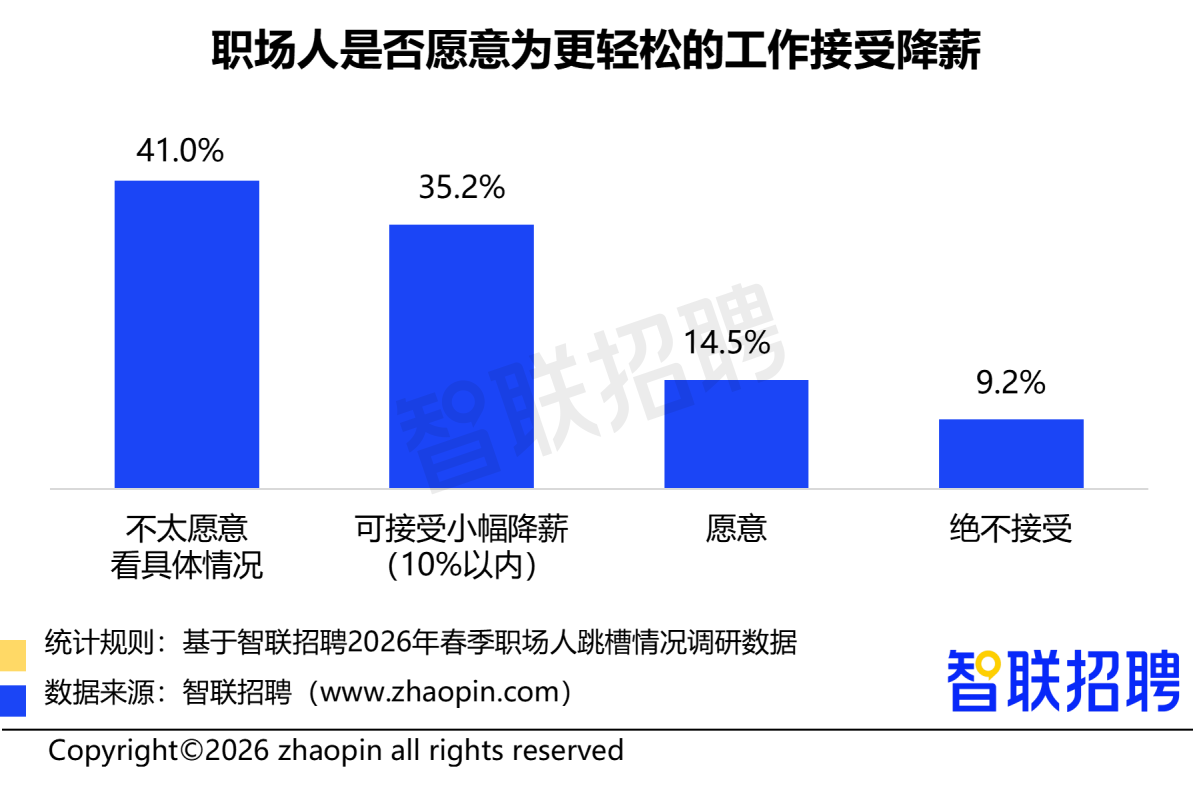 薪酬福利仍是跳槽首要动因,占比37.8%,其次是“企业发展前景不明,业务收缩”(29.7%)和“想转行”(22.7%)。在跳槽决策中,薪酬福利(44.2%)、岗位稳定性(30.8%)和工作生活平衡(21.6%)位列前三。半数职场人愿意为更轻松的工作接受降薪,其中35.2%可接受10%以内降幅。