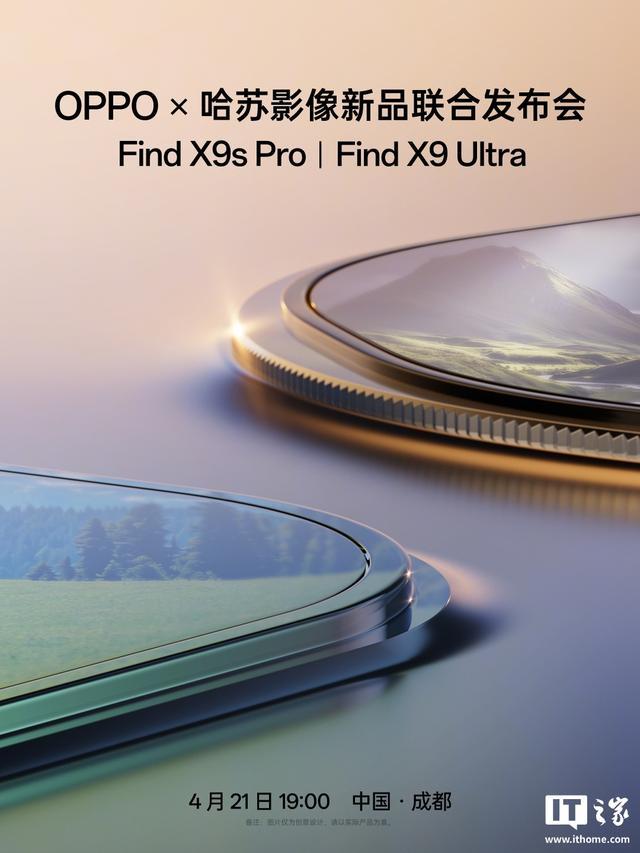 据IT之家此前报道,OPPO × 哈苏影像新品联合发布会已定档 4 月 21 日晚 19:00 在成都举办,届时将推出 Find X9s Pro、Find X9 Ultra 手机等新品。